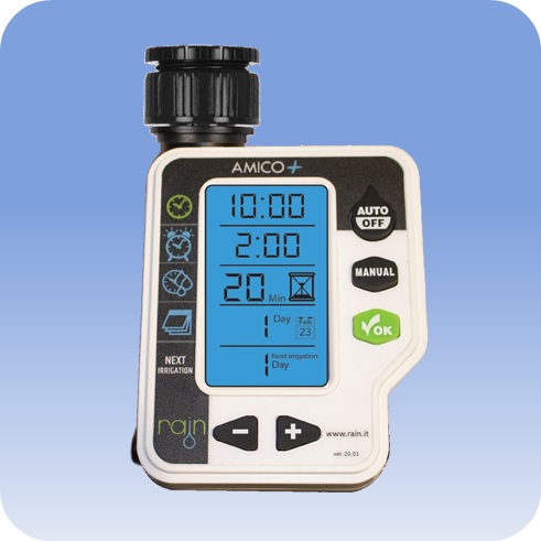 Jednotka AMICO + je batériový ventil na vodu, ktorý sa otvára a zatvára podľa jednoduchého časového programu. Amico sa vyznačuje veľmi jednoduchou obsluhou a jeho nastavenie zvládne aj menej skúsený užívateľ. Umožní spúšťať polievanie vašej záhradky cez pripojené hadicové rozvody aj počas vašej neprítomnosti, napríklad keď ste v práci. Stačí si iba nastaviť požadovaný program. AMICO má pomerne malú spotrebu energie a preto v ňom batérie vydržia dlho. Samozrejme odporúča sa používať kvalitné batérie (long life) s dlhou životnosťou. Pripojovací závit má dva rozmery 3/4" a 1" a je preto vhodný pre väčšinu ventilov a kohútikov.