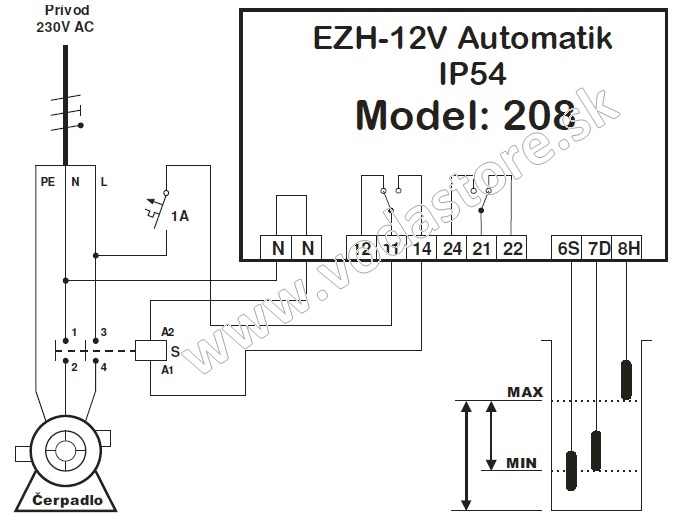 Hladinové relé EZH 12V automatik IP54- model 208 je zariadenie na presnú kontrolu výšky hladiny vodivých kvapalín cez hladinové i tlakové elektródové sondy. Možné využitie na ochranu čerpadla pred chodom na sucho, alebo ako systém pre udržiavanie konštantnej úrovne výšky hladiny v zásobníkoch vody, či na výstražné hlásenie pri zaplavení, alebo povel štart/stop pre frekvenčné meniče