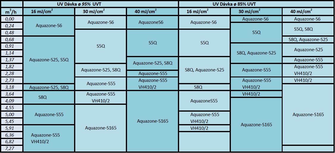 Pri kapacite žiarenia 40mJ/cm2 dokáže spracovať 1,7 m3/hod. (stredná hodnota, podrobnosti v tabuľke)