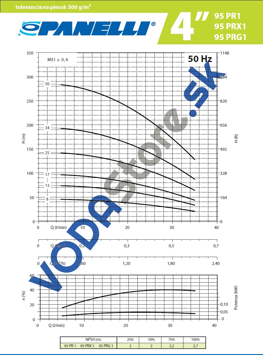 Čerpadlo 95 PR1 N/13-0,55kW- 400V/2A je ponorné viacstupňové 4" čerpadlo s jednofázovým motorom s mimoriadne odolnou konštrukciou čerpacích stupňov. Materiál plášťa, osadenie difúzorov, puzdrá kolies, hriadeľ, sacia mriežka sú z nehrdzavejúcej ocele, Horný a dolný suport je z kvalitnej mosadze vhodnej pre kontakt s pitnou vodou obežné kolesá sú z technopolyméru s výstužou zo sklených vlákien a majú plávajúce uloženie. Čerpadlá PR sú motorizované výlučne originálnymi európskymi motormi, na vysokú záťaž. Zvládajú i čerpanie z čerstvých vrtov s pieskovaním do 300g/m3. Vhodné do vrtov od priemeru 120mm. Vhodné pre čerpanie do závlah, do systémov tepelných čerpadiel voda/voda, čerpanie z vrtov, kopaných studní a nádrží a všade, kde je potrebný dostatočný výkon a spoľahlivosť. Hriadeľ hydrauliky má masívnu konštrukciu, najsilnejšiu na trhu ponorných 4" čerpadiel. Väčšina modelov PR 4 môže pracovať i v horizontálnej polohe. Len EU motory.