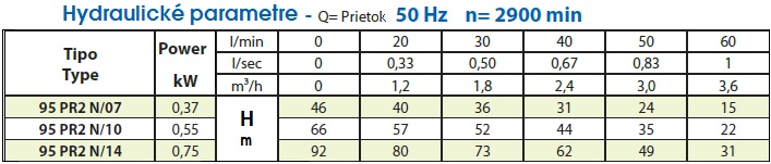Čerpadlo 95 PR2 N/14-0,75kW- 230V je ponorné viacstupňové 4" čerpadlo s jednofázovým motorom s mimoriadne odolnou konštrukciou čerpacích stupňov. Materiál plášťa, osadenie difúzorov, puzdrá kolies, hriadeľ, sacia mriežka sú z nehrdzavejúcej ocele, Horný a dolný suport je z kvalitnej mosadze vhodnej pre kontakt s pitnou vodou obežné kolesá sú z technopolyméru s výstužou zo sklených vlákien a majú plávajúce uloženie. Čerpadlá PR sú motorizované výlučne originálnymi európskymi motormi, na vysokú záťaž. Zvládajú i čerpanie z čerstvých vrtov s pieskovaním do 300g/m3. Vhodné do vrtov od priemeru 120mm. Vhodné pre čerpanie do závlah, do systémov tepelných čerpadiel voda/voda, čerpanie z vrtov, kopaných studní a nádrží a všade, kde je potrebný dostatočný výkon a spoľahlivosť. Hriadeľ hydrauliky má masívnu konštrukciu, najsilnejšiu na trhu ponorných 4" čerpadiel. Väčšina modelov PR 4 môže pracovať i v horizontálnej polohe.