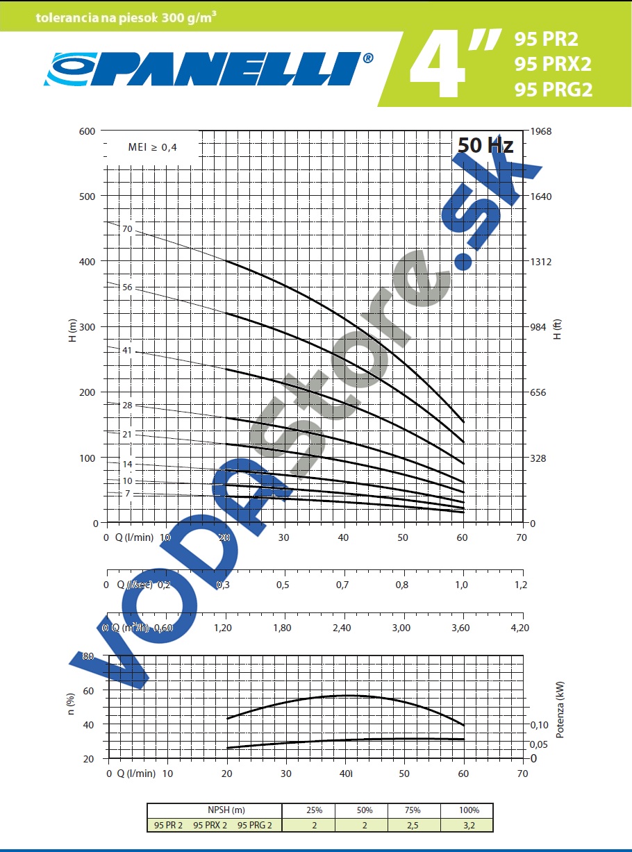 Čerpadlo 95 PR2 N/14-0,75kW- 400V/2,4A je ponorné viacstupňové 4" čerpadlo s jednofázovým motorom s mimoriadne odolnou konštrukciou čerpacích stupňov. Materiál plášťa, osadenie difúzorov, puzdrá kolies, hriadeľ, sacia mriežka sú z nehrdzavejúcej ocele, Horný a dolný suport je z kvalitnej mosadze vhodnej pre kontakt s pitnou vodou obežné kolesá sú z technopolyméru s výstužou zo sklených vlákien a majú plávajúce uloženie. Čerpadlá PR sú motorizované výlučne originálnymi európskymi motormi, na vysokú záťaž. Zvládajú i čerpanie z čerstvých vrtov s pieskovaním do 300g/m3. Vhodné do vrtov od priemeru 120mm. Vhodné pre čerpanie do závlah, do systémov tepelných čerpadiel voda/voda, čerpanie z vrtov, kopaných studní a nádrží a všade, kde je potrebný dostatočný výkon a spoľahlivosť. Hriadeľ hydrauliky má masívnu konštrukciu, najsilnejšiu na trhu ponorných 4" čerpadiel. Väčšina modelov PR 4 môže pracovať i v horizontálnej polohe.