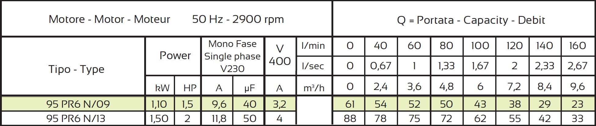 Čerpadlo 95 PR6 N/13-1,5kW- 230V je ponorné viacstupňové 4" čerpadlo s jednofázovým motorom s mimoriadne odolnou konštrukciou čerpacích stupňov. Materiál plášťa, osadenie difúzorov, puzdrá kolies, hriadeľ, sacia mriežka sú z nehrdzavejúcej ocele, Horný a dolný suport je z kvalitnej mosadze vhodnej pre kontakt s pitnou vodou obežné kolesá sú z technopolyméru s výstužou zo sklených vlákien a majú plávajúce uloženie. Čerpadlá PR sú motorizované výlučne originálnymi európskymi motormi, na vysokú záťaž. Zvládajú i čerpanie z čerstvých vrtov s pieskovaním do 300g/m3. Vhodné do vrtov od priemeru 120mm. Vhodné pre čerpanie do závlah, do systémov tepelných čerpadiel voda/voda, čerpanie z vrtov, kopaných studní a nádrží a všade, kde je potrebný dostatočný výkon a spoľahlivosť. Hriadeľ hydrauliky má masívnu konštrukciu, najsilnejšiu na trhu ponorných 4" čerpadiel. Väčšina modelov PR 4 môže pracovať i v horizontálnej polohe. Len EU motory.