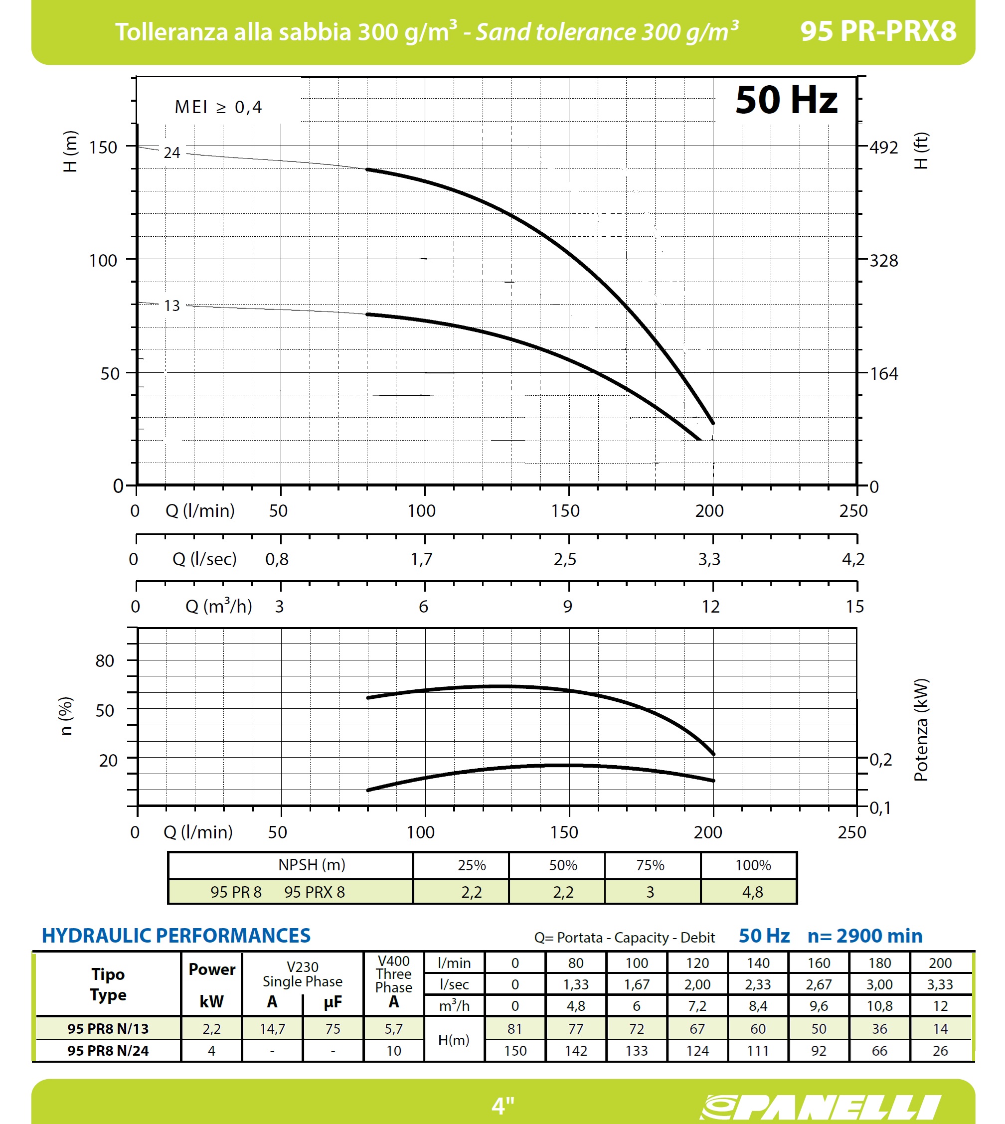 Čerpadlo 95 PR8 N/24-4kW/400V je ponorné viacstupňové 4" čerpadlo s trojfázovým motorom s mimoriadne odolnou konštrukciou čerpacích stupňov. Materiál plášťa, osadenie difúzorov, puzdrá kolies, hriadeľ, sacia mriežka sú z nehrdzavejúcej ocele, Horný a dolný suport je z kvalitnej mosadze vhodnej pre kontakt s pitnou vodou obežné kolesá sú z technopolyméru s výstužou zo sklených vlákien a majú plávajúce uloženie. Čerpadlá PR sú motorizované výlučne originálnymi európskymi motormi, na vysokú záťaž. Zvládajú i čerpanie z čerstvých vrtov s pieskovaním do 300g/m3. Vhodné do vrtov od priemeru 120mm. Vhodné pre čerpanie do závlah, do systémov tepelných čerpadiel voda/voda, čerpanie z vrtov, kopaných studní a nádrží a všade, kde je potrebný dostatočný výkon a spoľahlivosť. Hriadeľ hydrauliky má masívnu konštrukciu, najsilnejšiu na trhu ponorných 4" čerpadiel. Väčšina modelov PR 4 môže pracovať i v horizontálnej polohe. Len EU motory.