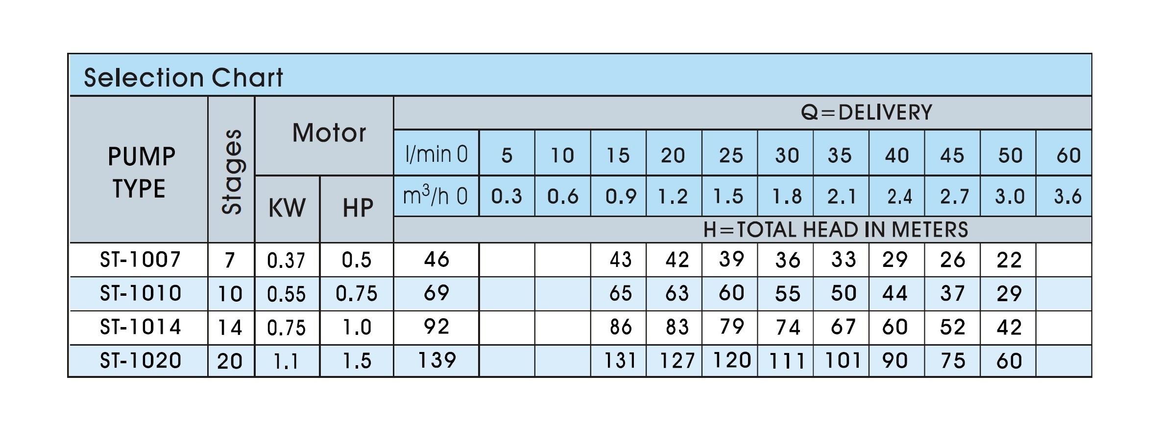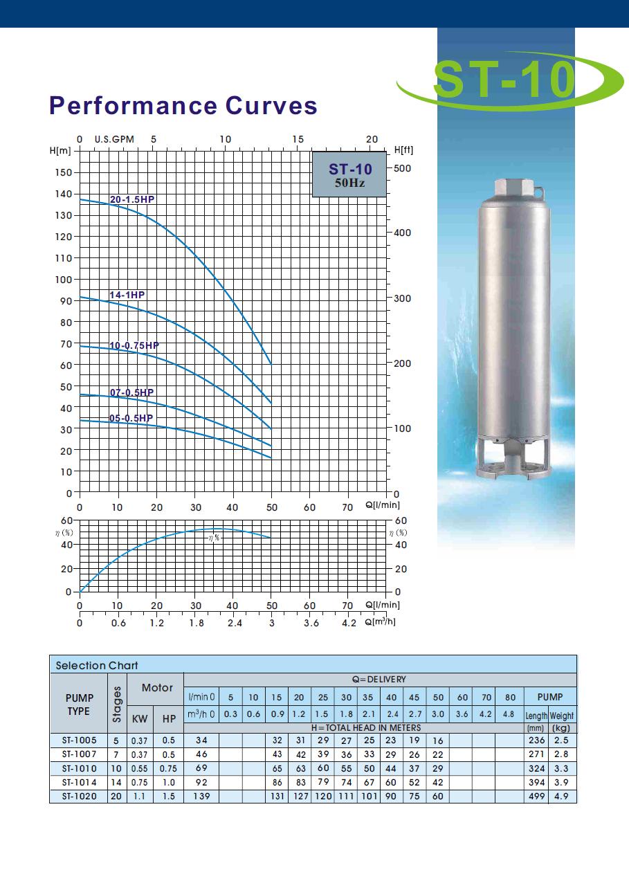 A ST 1010 je profesionálne ponorné viacstupňové 4" čerpadlo s odolnou konštrukciou jednotlivých stupňov. Materiál plášťa, osadenie difúzorov, puzdrá kolies, hriadeľ, výtlačné hrdlo, sacia mriežka sú z nehrdzavejúcej ocele, obežné kolesá sú z technopolyméru NORYL a majú plávajúce uloženie. Zvládajú i čerpanie z čerstvých vrtov s pieskovaním do 120g/m3. Vhodné do vrtov od priemeru 120mm. Vhodné pre čerpanie do závlah, do systémov tepelných čerpadiel voda/voda, čerpanie z vrtov, kopaných studní a nádrží a všade, kde je potrebný dostatočný výkon a spoľahlivosť. Profi trieda.
