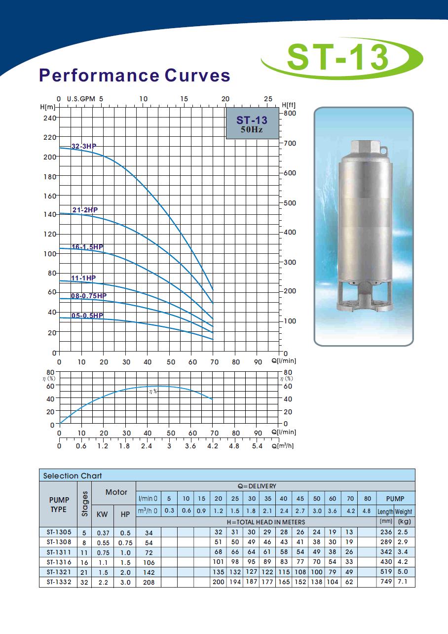 A-ST 1308 je profesionálne ponorné viacstupňové 4" čerpadlo pre zvýšenú záťaž s odolnou konštrukciou jednotlivých stupňov. Materiál plášťa, osadenie difúzorov, puzdrá kolies, hriadeľ, výtlačné hrdlo, sacia mriežka sú z nehrdzavejúcej ocele, obežné kolesá sú z technopolyméru NORYL a majú plávajúce uloženie. Vhodné do vrtov od priemeru 120mm. Zvládajú i čerpanie z čerstvých vrtov s pieskovaním do 120g/m3. Vhodné pre čerpanie do závlah, do systémov tepelných čerpadiel voda/voda, čerpanie z vrtov, kopaných studní a nádrží a všade, kde je potrebný dostatočný výkon a spoľahlivosť.