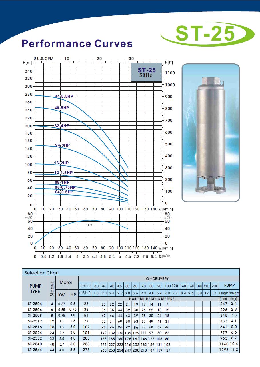A-ST 25/16/230V/1,5kW je profesionálne ponorné viacstupňové 4" čerpadlo pre zvýšenú záťaž s odolnou konštrukciou jednotlivých stupňov. Materiál plášťa, osadenie difúzorov, puzdrá kolies, hriadeľ, výtlačné hrdlo, sacia mriežka sú z nehrdzavejúcej ocele, obežné kolesá sú z technopolyméru NORYL a majú plávajúce uloženie. Zvládajú i čerpanie z čerstvých vrtov s pieskovaním do 120g/m3. Vhodné do vrtov od priemeru 120mm. Vhodné pre čerpanie do závlah, do systémov tepelných čerpadiel voda/voda, čerpanie z vrtov, kopaných studní a nádrží a všade, kde je potrebný dostatočný výkon a spoľahlivosť. Profi trieda.