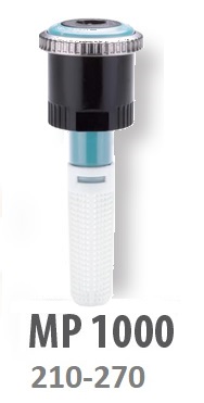 Rotačná tryska MP 1000 s rotujúcimi vodnými lúčmi ,nastaviteľná výseč 210°- 270º, dostrek 3,7m - 4,5m, prietok 0,09 – 0,15 m3/h, optimálny prevádzkový tlak 2,8 bar. Určené pred modely telies statických postrekovačov s vonkajším závitom pre trysku.