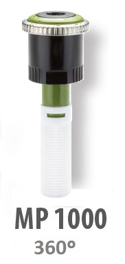 Rotačná tryska MP 1000 s rotujúcimi vodnými lúčmi 360º, dostrek 3,7m - 4,5 m, prietok 0,14 - 0,20 m3/h, optimálny prevádzkový tlak 2,8 bar – rádius dostreku je možné redukovať do 25%. Určené pred modely telies statických postrekovačov s vonkajším závitom pre trysku.