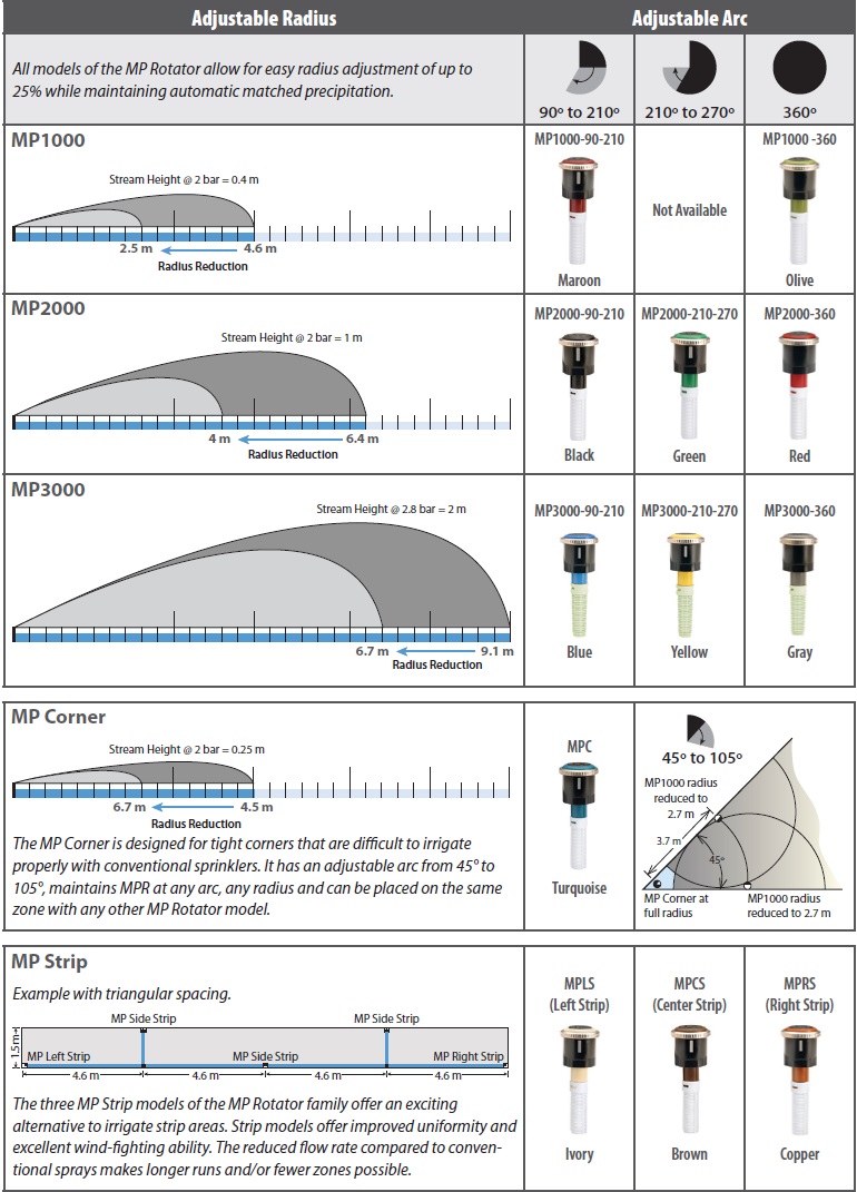 MP Rotator - Séria rotačných trysiek, ktoré vytvárajú vodné lúče, určených pre montáž do statických telies postrekovačov. Vvyznačujú sa nízkou spotrebou vody. Trysky majú vnútorný závit. Pokračovať