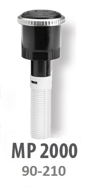 Rotačná tryska MP 2000 s rotujúcimi vodnými lúčmi nastaviteľná výseč 90°- 210º, dostrek 5,2m - 6,4 m, prietok 0,04 - 0,11 m3/h, optimálny prevádzkový tlak 2,8 bar – rádius dostreku je možné redukovať do 25%. Určené pred modely telies statických postrekovačov s vonkajším závitom pre trysku.