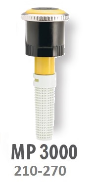 Rotačná tryska MP 3000 s rotujúcimi vodnými lúčmi nastaviteľná výseč 210°- 270º, dostrek 6,7m - 9,1 m, prietok 0,16 - 0,98 m3/h, optimálny prevádzkový tlak 2,8 bar – rádius dostreku je možné redukovať do 25%. Určené pred modely telies statických postrekovačov s vonkajším závitom pre trysku.