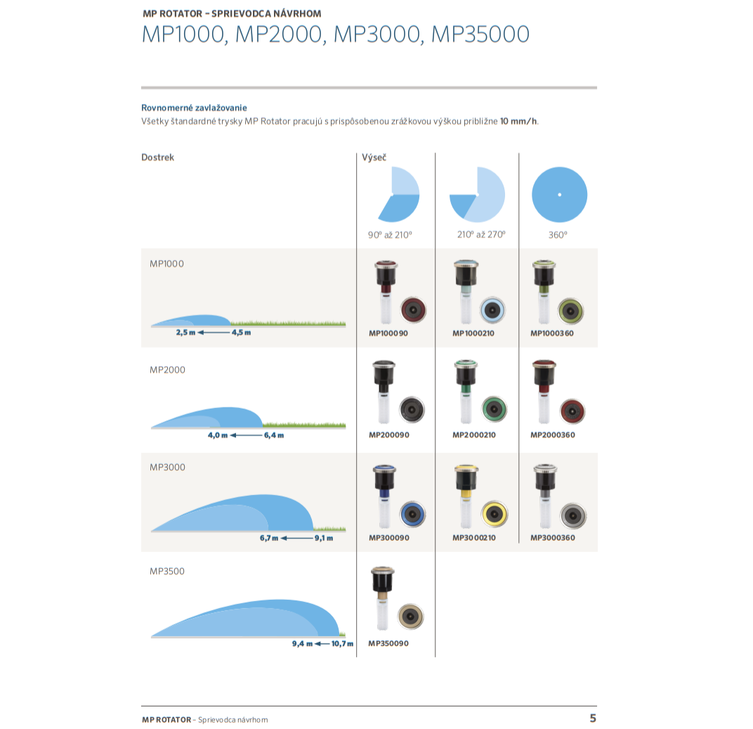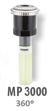 Rotačná tryska MP 3000 s rotujúcimi vodnými lúčmi výseč 360º, dostrek 6,7m - 9,1 m, prietok 0,16 - 0,98 m3/h, optimálny prevádzkový tlak 2,8 bar – rádius dostreku je možné redukovať do 25%. Určené pred modely telies statických postrekovačov s vonkajším závitom pre trysku.