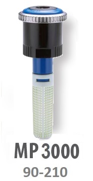 Rotačná tryska MP 3000 s rotujúcimi vodnými lúčmi nastaviteľná výseč 90°- 210º, dostrek 6,7 m - 9,1 m, prietok 0,16 - 0,98 m3/h, optimálny prevádzkový tlak 2,8 bar – rádius dostreku je možné redukovať do 25%. Určené pred modely telies statických postrekovačov s vonkajším závitom pre trysku.