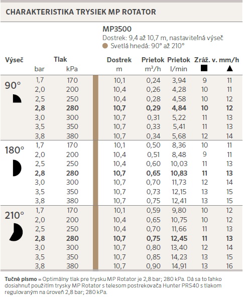 Rotačná tryska MP 3500 s rotujúcimi vodnými lúčmi nastaviteľná výseč 90°- 210º, dostrek 10,1m - 10,4 m, prietok 0,24 - 0,90 m3/h, optimálny prevádzkový tlak 2,8 bar – rádius dostreku je možné redukovať do 25%. Určené pred modely telies statických postrekovačov s vonkajším závitom pre trysku.