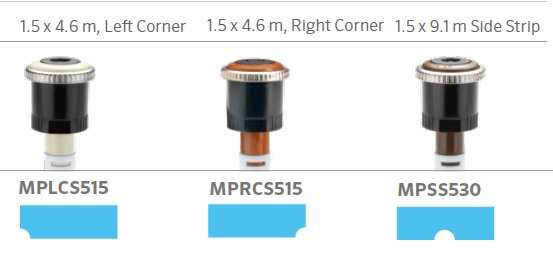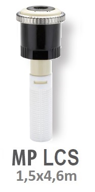 Rotačná tryska MP LCS s rotujúcimi vodnými lúčmi pásový dostrek s rozmermi 1,5m - 4,6 m, prietok 0,04-0,06 m3/h, optimálny prevádzkový tlak 2,8 bar – rádius dostreku je možné redukovať do 25%. Určené pred modely telies statických postrekovačov s vonkajším závitom pre trysku.