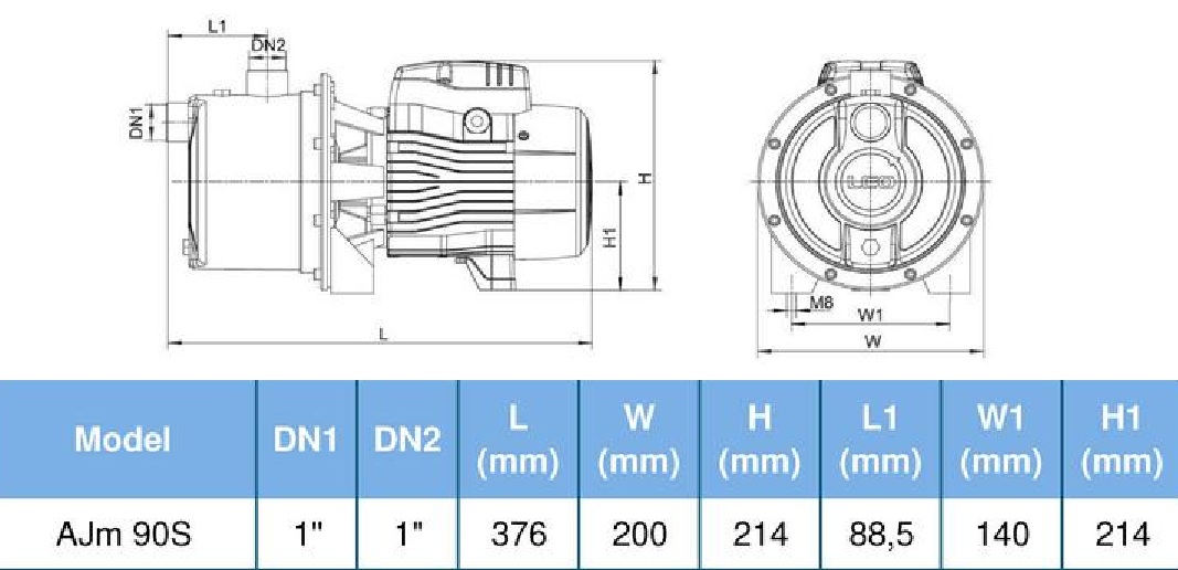 Čerpadlá LEO série AJm 90S sú horizontálne samonasávacie odstredivé čerpadlá k doprave vody alebo iných riedkych, neagresívnych a neexplodujúcich tekutín bez abrazívnych a dlhovláknitých prímesí, vhodné pre zásobovanie vodou, zvyšovanie tlaku a pre malé závlahové systémy z narážaných studní . Maximálna sacia hĺbka 8 metrov, optimálny pracovný bod 1,8 m3/hod pri tlaku 3,4 bar.