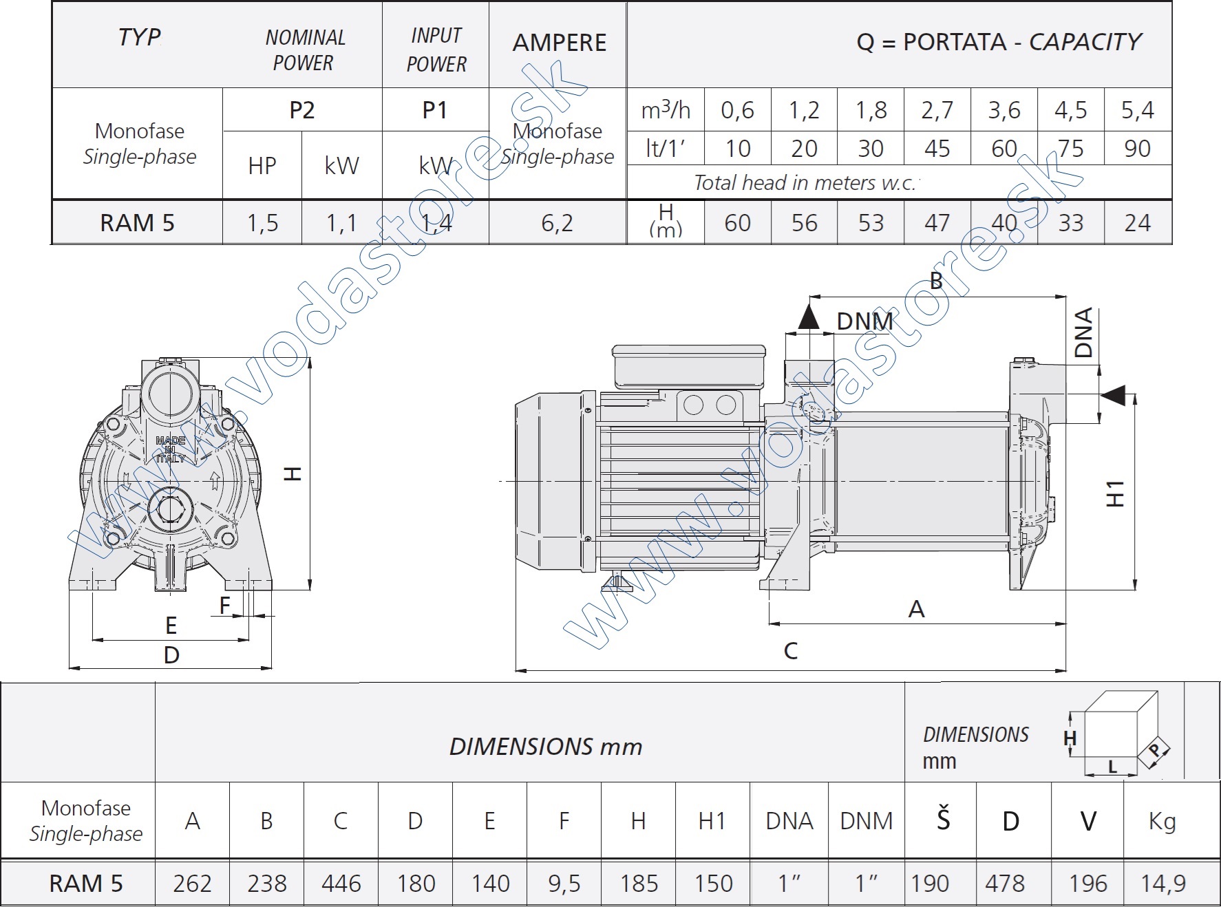 Spoľahlivé samonasávacie viacstupňové odstredivé čerpadlo kvalitnej konštrukcie od známeho Talianskeho výrobcu Speroni, vhodné pre zásobovanie vodou z narážaných studní a vrtov. Maximálna sacia hĺbka 7 metrov, optimálny pracovný bod 3,6 m3/hod pri tlaku 4 bary. Príkon 1400W Maximálna dopravná výška 60m, max. prietok 5,4 m3. Podrobné technické parametre nájdete v prílohách. Čerpadlá Speroni série RAM sú horizontálne samonasávacie odstredivé čerpadlá k doprave vody alebo iných riedkych, neagresívnych a neexplodujúcich tekutín bez abrazívnych a dlhovláknitých prímesí. Čerpadlá série RAM sa používajú predovšetkým pre zásobovanie vodou alebo na zvyšovanie tlaku. Podrobné hodnoty výkonov nájdete v prílohe.