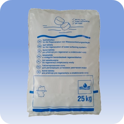 Tabletovaná soľ pre úpravne vody 25kg balenie. Určená pre zmäkčovače vody na regeneráciu intomeničových náplní v úpravniach.