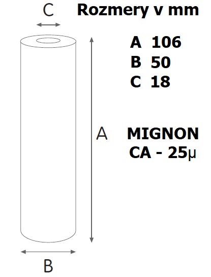 Filtračná vložka CA Mignon SX 25mcr s uhlíkom a stredne jemnou filtráciou cez povrchovú textíliu do telies filtrov MIGNON, s prietokovým otvorom 18mm. Slúži predovšetkým na odstránenie pesticídov, herbicídov, zlúčenín chlóru s kovmi, ťažkých kovov a iných toxínov z vody. Nakoľko sa jedná o uhlík, je potrebné pri čerpaní zo studní pred tento filter zaradiť dezinfekciu proti usádzaniu baktérií, napr UV lampu. V rozvodoch s chlórovanou vodou