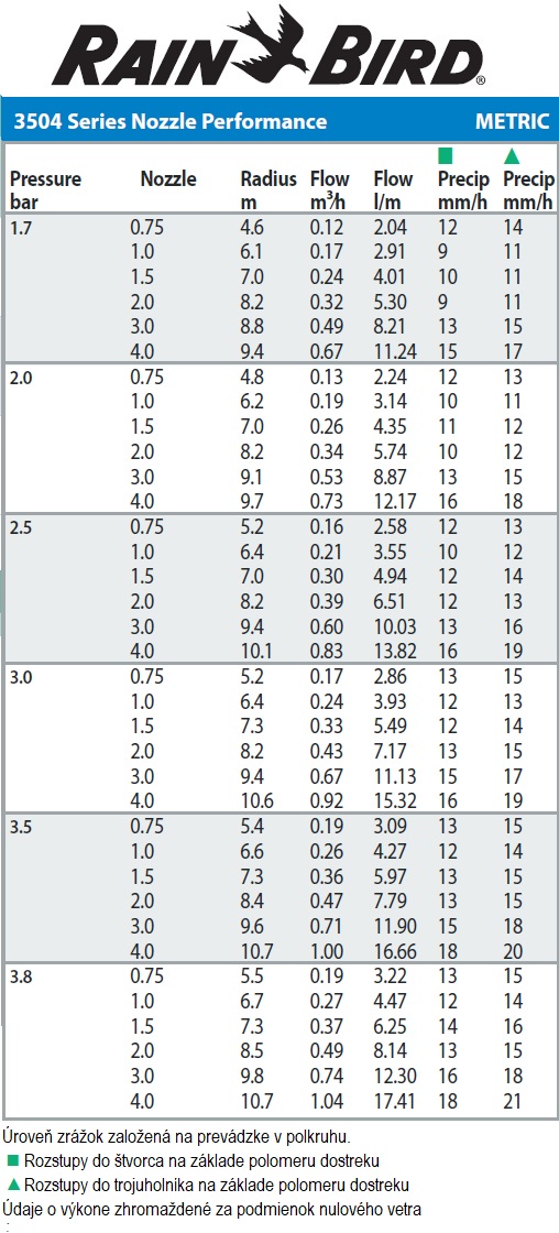 Výsuvný postrekovač 3504-PC-SAM s rotačnou hlavou, dostrek 4,6 až 10,7 metra (podľa tlaku a nasadenej trysky). Model SAM má zabudovaný spätný ventil. Pokračovať