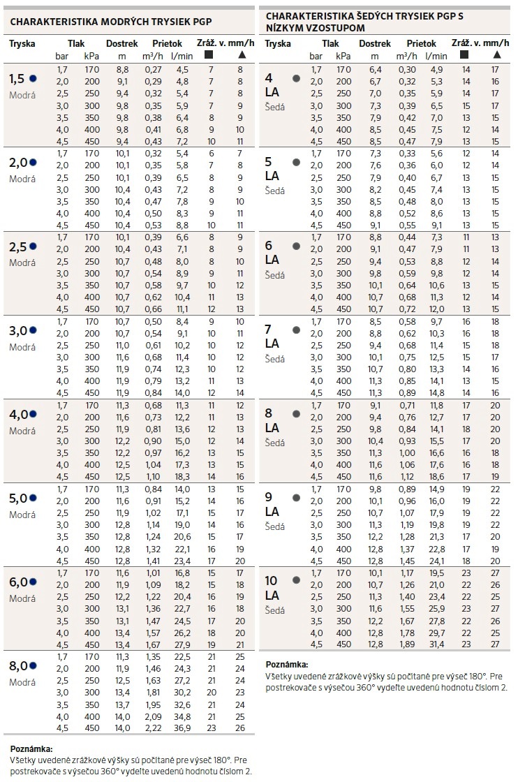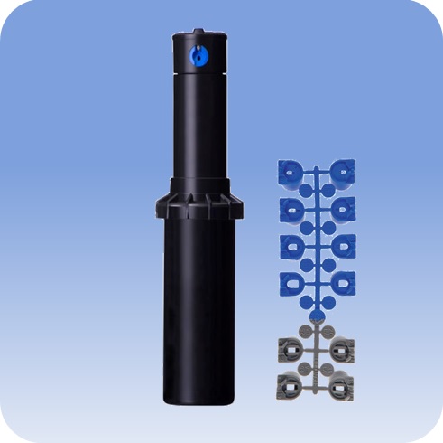 Rotačný výsuvný postrekovač PGP-ADJ, dostrek 4,9-14m, výsuv 10cm, uhol 50°-360°, Základná sada trysiek: 8 ks (modré) štandardne + 4 ks (sivé) s nízkym uhlom. Mechanizmus "antivandal" Pokračovať