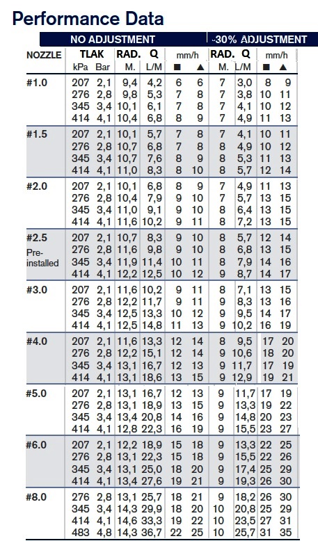 Výsuvný postrekovač s rotačnou hlavou, dostrek 5 až 14,5 metra (podľa tlaku a nasadenej trysky). Pokračovať