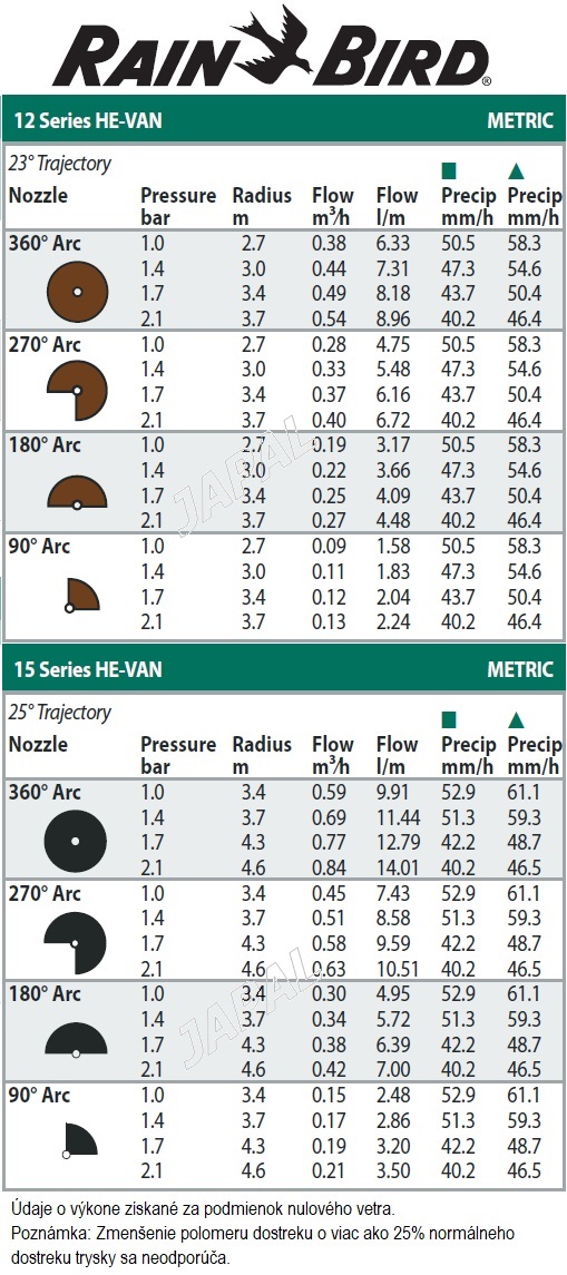 Tryska Rain Bird typu HE-VAN 12 je statická s dostrekom do 3,7 m určená pre montáž do telies statických výsuvných postrekovačov. Pokračovať