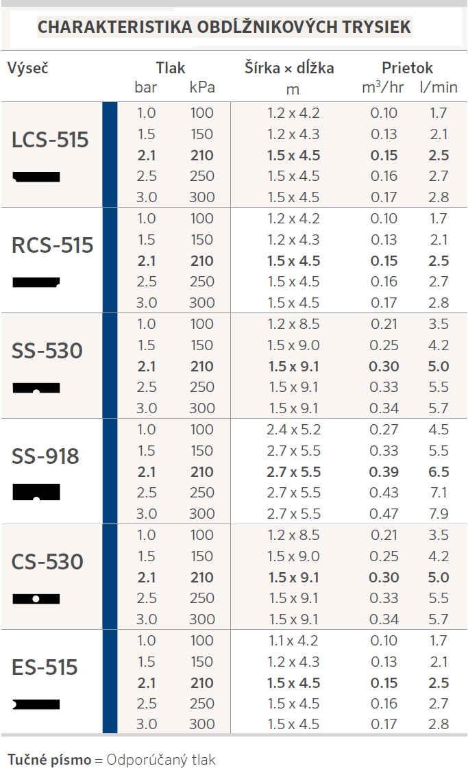 - Tryska je kompatibilná s väčšinou statických telies postrekovačov na trhu, podmienkou je ukončenie výsuvníka vonkajším závitom pre trysku